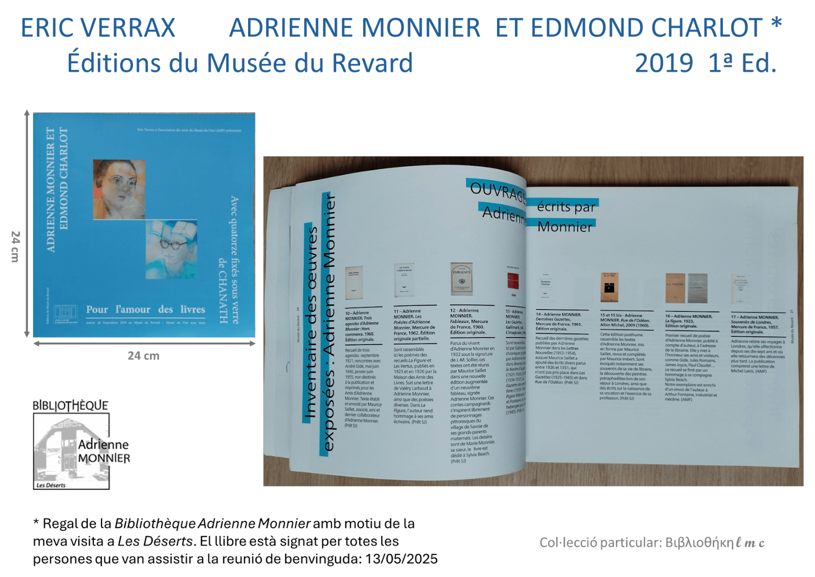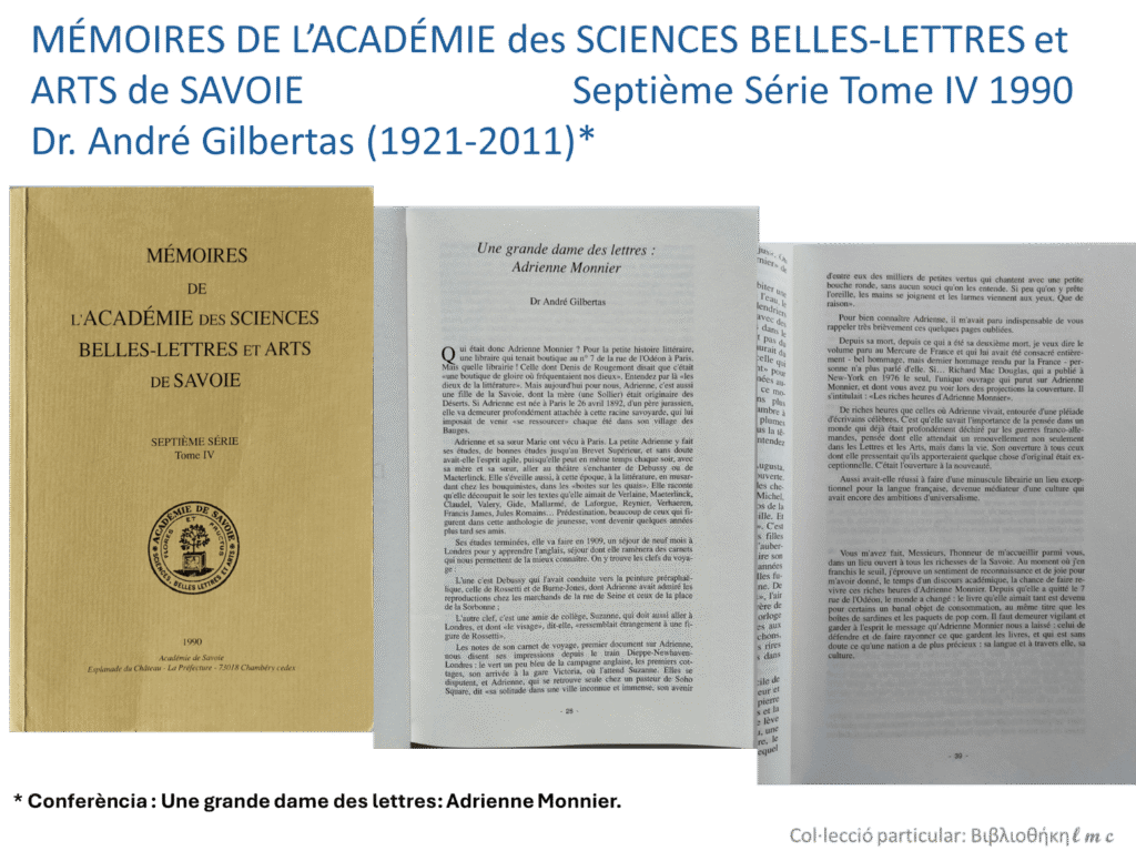 1) LES DÉSERTS: BIBLIOTHÈQUE MUNICIPALE ADRIENNE MONNIER 2) CHAMBERY: ACADÉMIE DES SCIENCES BELLES-LETTRES ET ARTS DE SAVOIE Quan per primer cop vaig veure el rètol de la Bibliothèque Adrienne Monnier, l’entranyable…