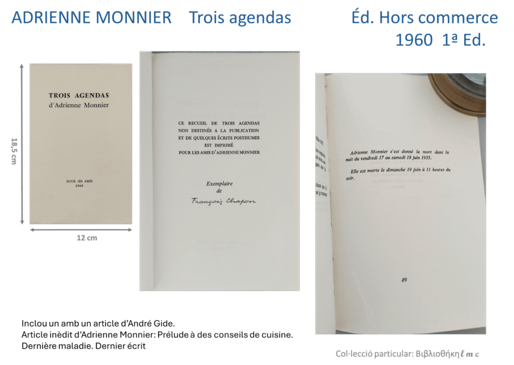 Trois agendas d’Adrienne Monnier, 1960, pàgina 89. Recull de textos breus editat per uns quants amics d’Adrienne Monnier on en la darrera pàgina del llibret s’inclouen dades sobre la seva mort. Degut al sofriment permanent provocat pel soroll a les orelles, producte de la malaltia de Ménière, Adrienne Monnier es va treure la vida. Les fonts consultades oficialitzen la seva mort el dia 19 de juny del 1955.
