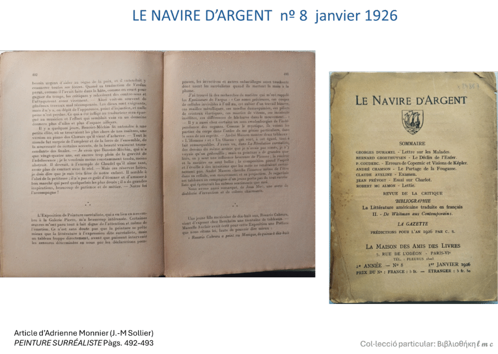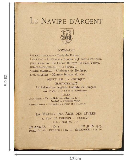 Em fa molta il·lusió explicar aquí que fa uns dies vaig rebre el número 1 de la revista Le Navire d’Argent on Valery Larbaud i T.-S Eliot tenen l’honor de ser els primers articulistes i Adrienne Monnier, sota el seu pseudònim J.-M Sollier, tanca el sumari d’aquest important número inaugural. Vull agrair aquí la feina feta pel Marc Malfant de la Librairie du Scalaire (a Lió). Ell ha estat el responsable d’aconseguir-me aquesta joia literària, gràcies a la seva permanent recerca bibliogràfica de llibres vells i antics. Cal recordar que en l’anterior post del blog ja constato que d’aquesta revista només se’n van publicar 12 números entre el juny del 1925 i l’abril del 1926, per tant aquests exemplars han complert o estan a punt de complir cent anys.