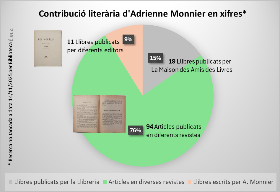 La gràfica adjunta permet visualitzar les publicacions escrites per Monnier: 11 llibres (6 pòstums), 19 llibres publicats sota l’abric de La Maison des Amis des Livres i 94 articles.