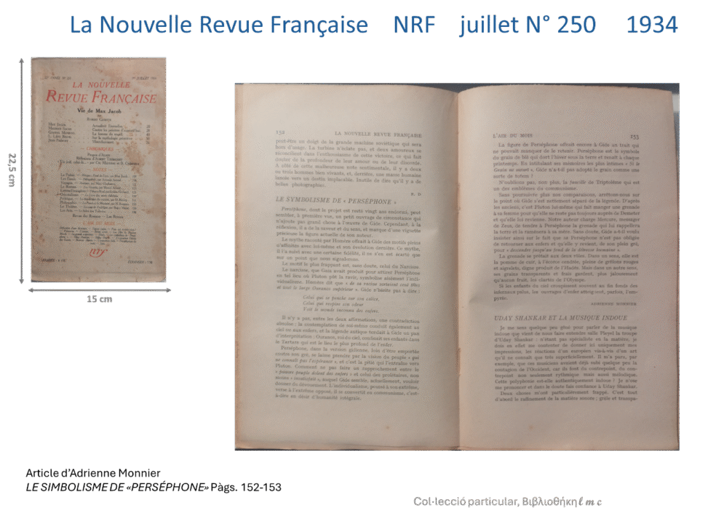 Le symbolisme de Perséphone, publicat al nº 250 de la revista Nouvelle Revue Française, juliol de 1934.