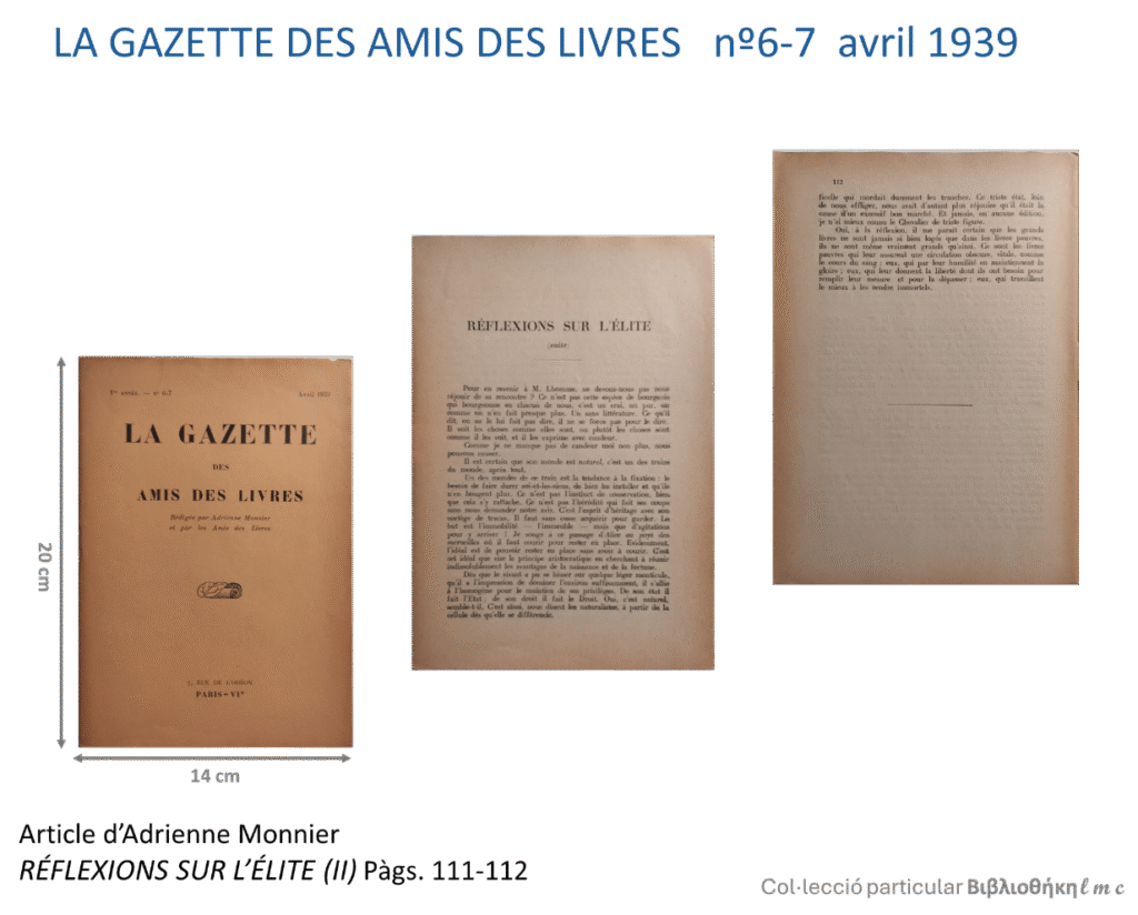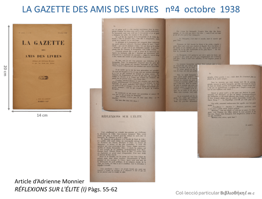 Crec que Monnier va aprofitar estratègicament la invitació a escriure en aquestes dues revistes per a obrir un front dialèctic en el món del llibre, dels editors, impressors, escriptors i artistes. El maig de l’any 1938, d’una manera subtil, torna a escriure sobre el tema amb la publicació, de l’article De la crise du livre al nº 2 de la revista La Gazette des Amis des Livres. És un article que possiblement cal considerar com a resposta a l’article La question de l’élit, de Jean Giraudoux, publicat al nº 294 de la Nouvelle Revue Française, el març de l’any 1938.