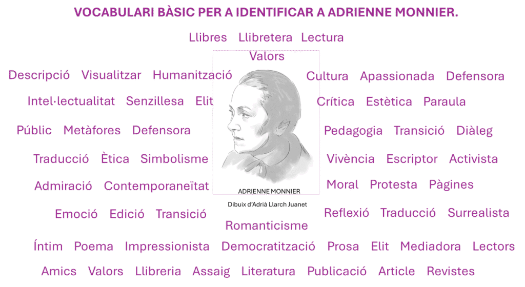 Entremig dels comentaris relacionats amb cadascun dels nou articles descrits en aquest post haureu vist alguna paraula escrita en color violeta. Son expressions i conceptes que, al meu entendre, conformen una unitat, perfilen i ajuden a conèixer una mica més a Adrienne Monnier: la seva personalitat, la llibreria, la literatura i la lectura.