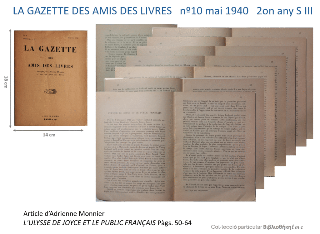 L’Ulysse de Joyce et le public français, publicat al nº 10 de la revista La Gazette des Amis des Livres, maig de 1940.
