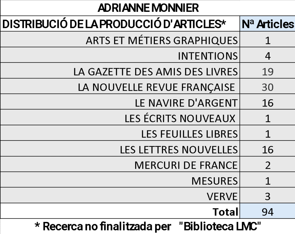 És probable que els articles escrits per Adrienne Monnier siguin més de cent. Aquesta xifra pot semblar poc representativa per alguns estudiosos però crec que és més important la qualitat que la quantitat. Certament, és baixa si la comparem, per exemple, amb la producció d’articles del seu gran amic Valery Larbaud, traductor i escriptor. Aquest POTASSON en va escriure 2833Amélie Auzoux: Valery Larbaud, «cosmopolite» des lettres?. Classiques GARNIER, 2021, París, pàg. 783. a revistes franceses. L’obra de Monnier no es pot valorar per la quantitat de llibres escrits o editats ni pel nombre d’articles publicats. Ella no es considerava escriptora, però va escriure; no es considerava editora, però va editar; no era articulista assídua però va escriure molts bons articles. Era sobretot això: una llibretera i una activista literària.