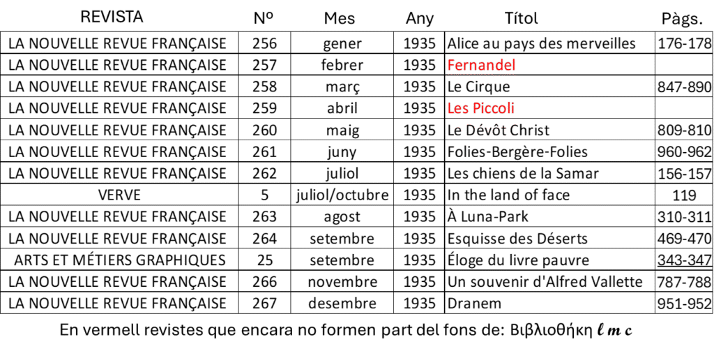 Per què he dit estratègia comercial? Perquè l’article Éloge du livre pauvre es publica en una revista per a rics, per a l’elit, en un moment en què la proliferació de revistes literàries de baix preu inundaven les llibreries i quioscos dels bouquinistes. El fet de ser defensora del llibre econòmic no impedeix a Monnier d’escriure altres articles en revistes de gamma alta. L’exemple més clar es produeix l’any 1935. Aquest any, el de més producció d’articles de Monnier, en publica tretze. Onze d’aquests articles (consultar el quadre adjunt) es publiquen a la revista La Nouvelle Revue Française, d’abast internacional, i dos en revistes elitistes de perfil literari i artístic com van ser ARTS ET MÉTIERS GRAPHIQUES i VERVE. Aquestes revistes només eren a l’abast de l’elit i dels bibliòfils.