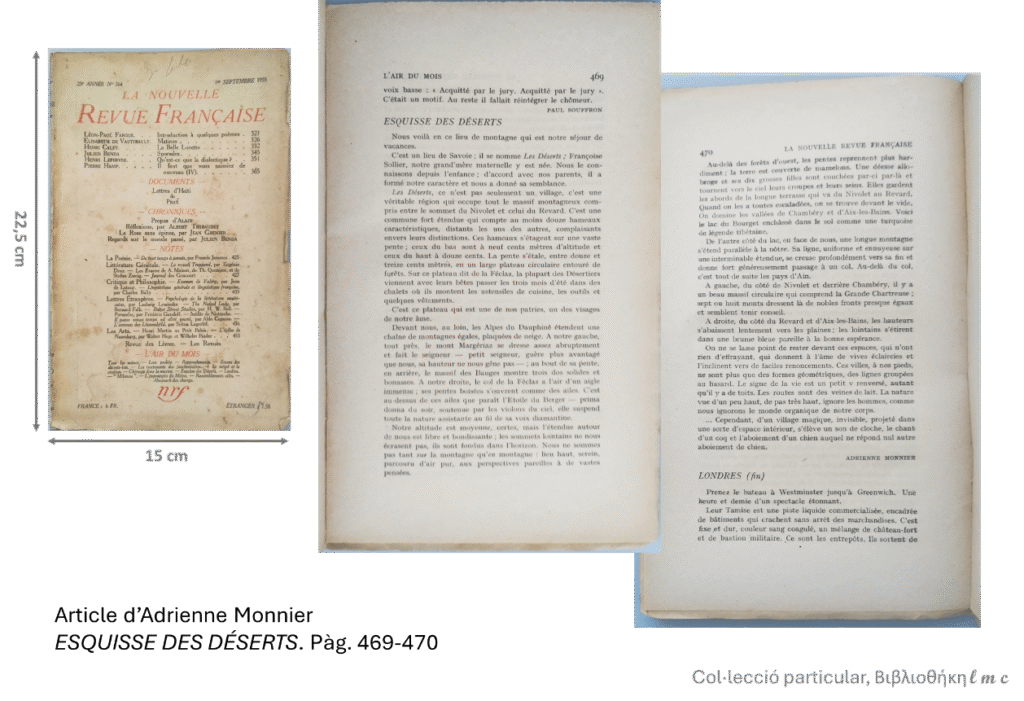 Aquest breu article, publicat l’any 1935 a la NRF, Monnier el dedica a les contrades on va néixer la seva àvia. A Les Déserts Monnier, Beach i el seu gos hi passaven molts estius. Als posts 3 i 4 d’aquest blog ja faig referència a aquesta regió francesa, la Savoia. Va ser un viatge, el meu, molt interessant i del que guardo un gran record.