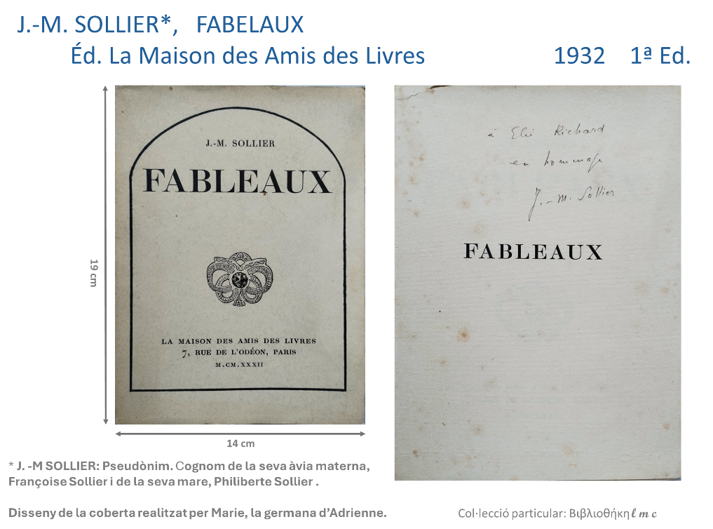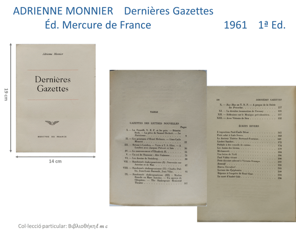 Els 19 llibres publicats per La Maison des Amis des Livres mereixen un post específic. El mateix podem dir dels 11 llibres d’Adrienne Monnier, publicats per diferents editors. Al llarg del primer trimestre del proper any 2026 crec que estaré en disposició de penjar aquests dos posts al blog.