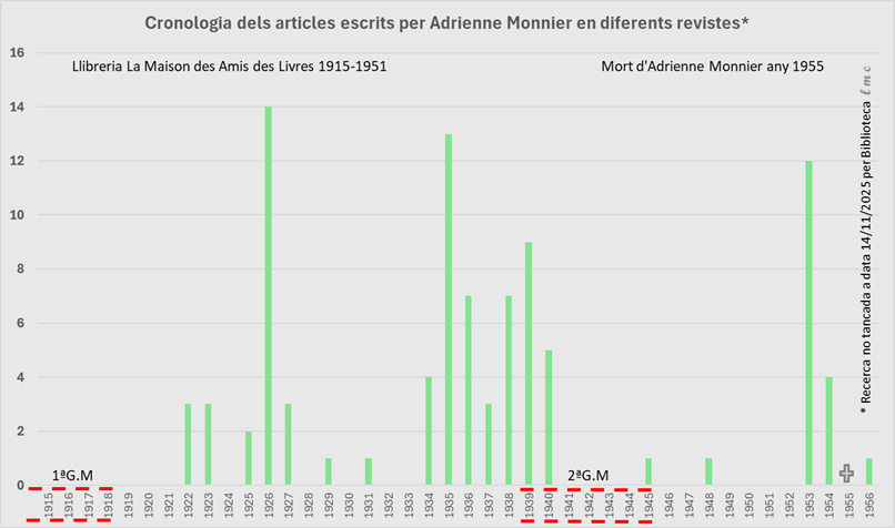 L’anàlisi cronològica respecte a la publicació d’articles de Monnier permet distingir, quantitativament parlant, tres períodes: el primer, poc després de la 1ª guerra mundial, entre els anys 1922 i 1927, que es pot qualificar com Diversificació d’articles. La minsa producció d’articles publicats al llarg dels següents anys es deu, al meu entendre, a l’esforç titànic que li va representar la traducció al francès, edició, publicació i distribució del llibre Ulysse de James Joyce. El segon període, entre els anys 1934 i 1940, que és el període més productiu, es pot descriure com de Concentració d’articles. Cal dir que l’any 1940 és l’any de la ocupació alemanya de París. La llibreria tanca i no obrirà de nou les portes fins que s’acabi la guerra. El tercer període destacable es situa entre el tancament definitiu de La Maison des Amis de Livres, l’any 1951, i la mort de Monnier l’any 1955. Es pot definir com d’Exclusivitat d’articles.