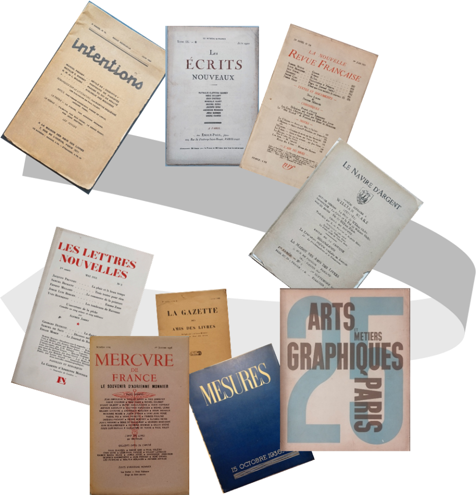 El primer període, Diversificació d’articles, destaca per una certa varietat de revistes on Adrienne Monnier va publicar: Intentions, Les Écrits Nouveaux, Le Navire d’Argent i La Nouvelle Revue Française (NRF). En les tres primeres revistes citades Monnier dedica poemes a bons amics literats: Gide, Larbaud, Léon-Paul Fargue i a la seva amiga pintora i gravadora Marie Laurencin. En canvi, el segon període, Concentració d’articles, destaca per l’acumulació d’articles en dues revistes. Els vint-i-cinc articles de Monnier editats per la prestigiosa i important revista literària NRF es publiquen entre els anys 1934 i 1938, abans del canvi d’orientació de la revista de l’any 1940 i del seu tancament l’any 1943. És possible que Monnier, conscient del buit deixat per la NRF, fes un nou esforç econòmic i edités La Gazette des Amis des Livres, on pot expressar-se lliurement. Aquí és on apareixen en exclusiva dinou articles. En aquest període, Adrienne Monnier també publica en revistes de gran prestigi literari i artístic com: Mesures (un article), ARTS ET MÉTIERS GRAPHIQUES (un article) i VERVE (un article)7Cal recordar que les xifres, nombre d’articles i revistes poden augmentar ja que, com es diu al llarg dels post, la recerca dels articles, a data de desembre de 2025, no està finalitzada.. En aquests anys també col·labora amb breus gazettes (articles curts) a diferents setmanaris com per exemple Vendredi, Le Figaro Littéraire, Fontaine, etc.