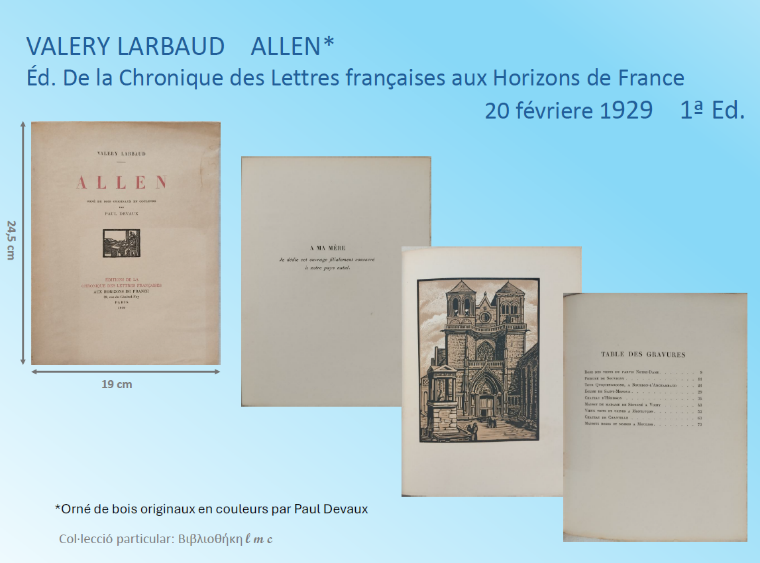 El 20 de febrer de l’any 1929, l’editorial DE LA CHRONIQUE DES LETTRES FRANÇAISES AUX HORIZONS DE FRANCE també publica ALLEN, en una edició lleugerament més modesta amb xilografies de Paul Devaux.